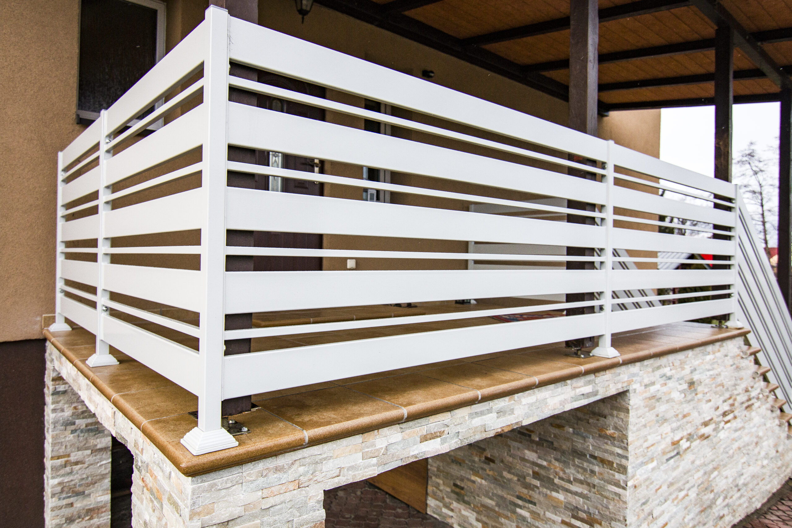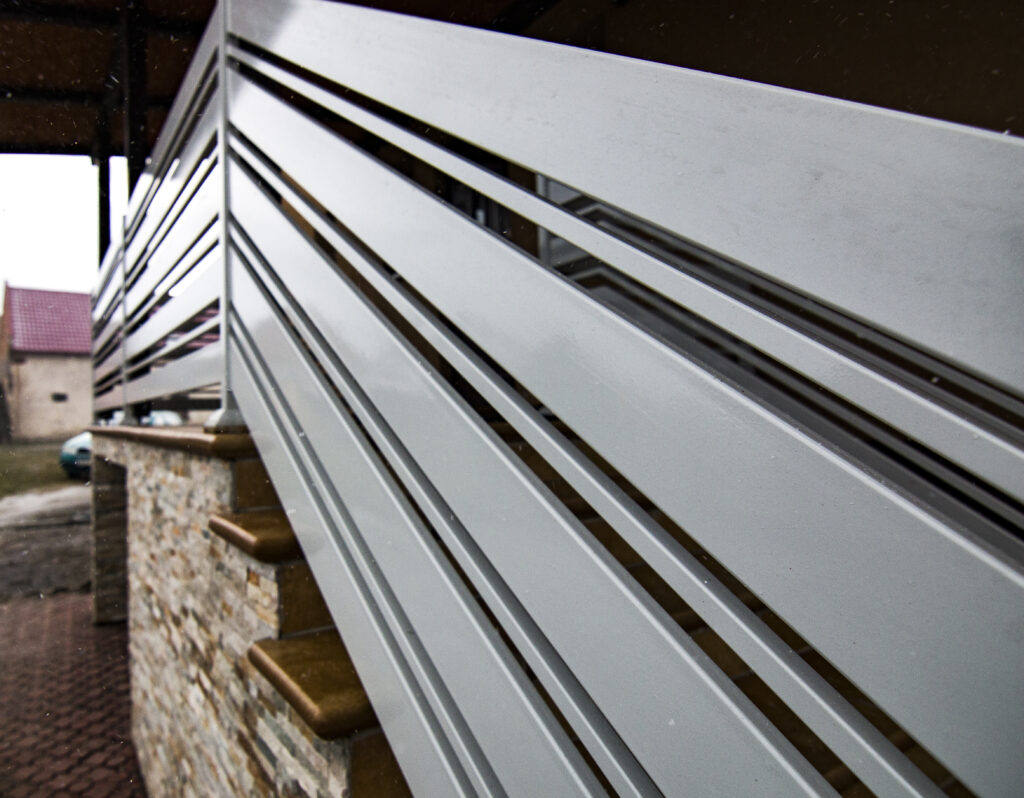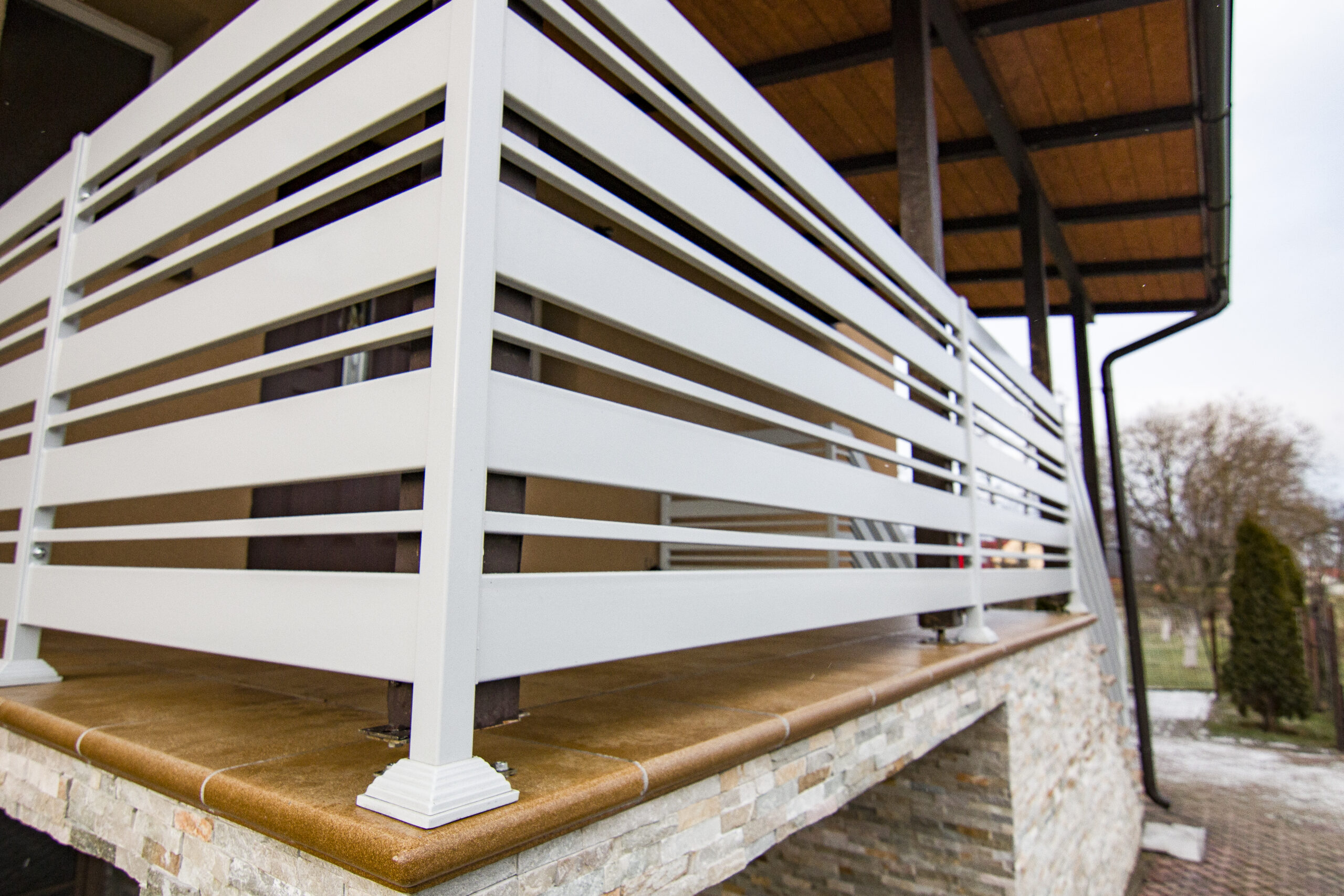 Stalowa balustrada balkonowa zewnętrzna, z malowaniem proszkowym na biało.