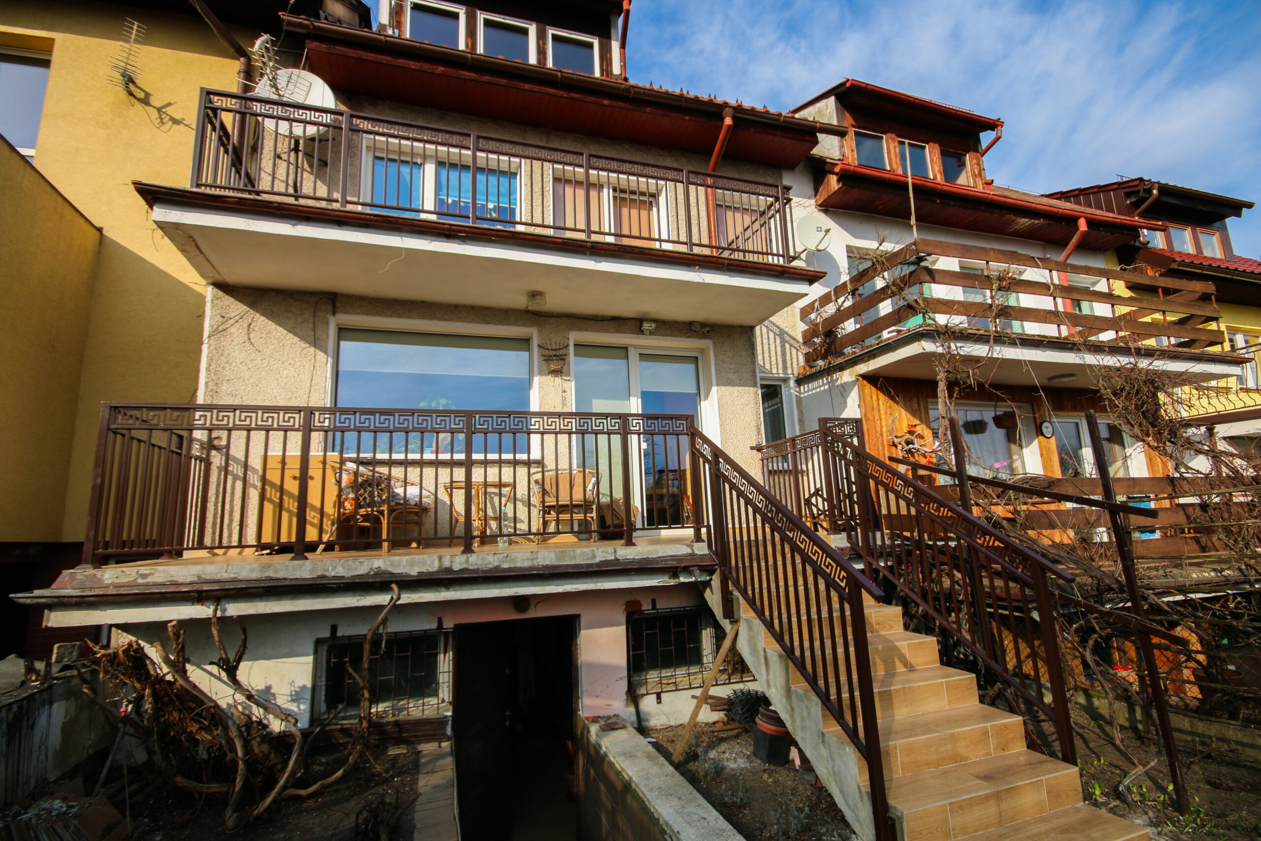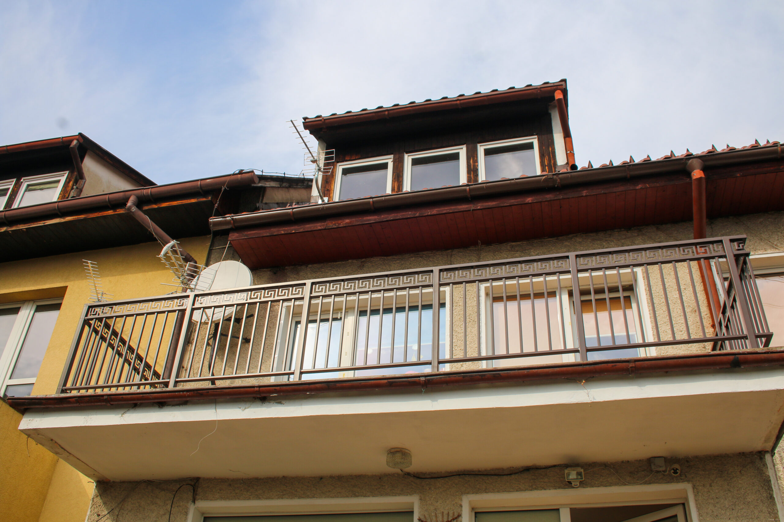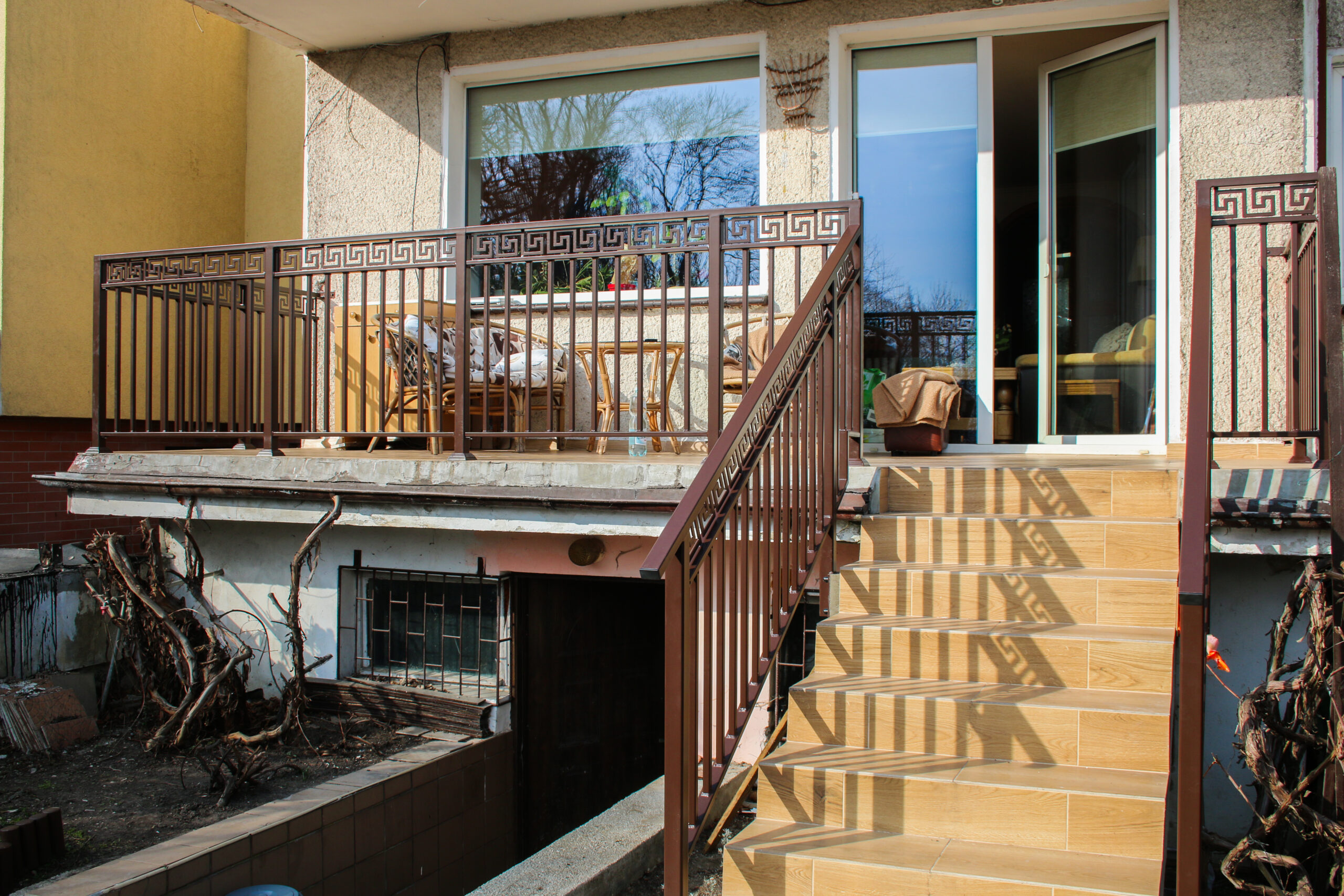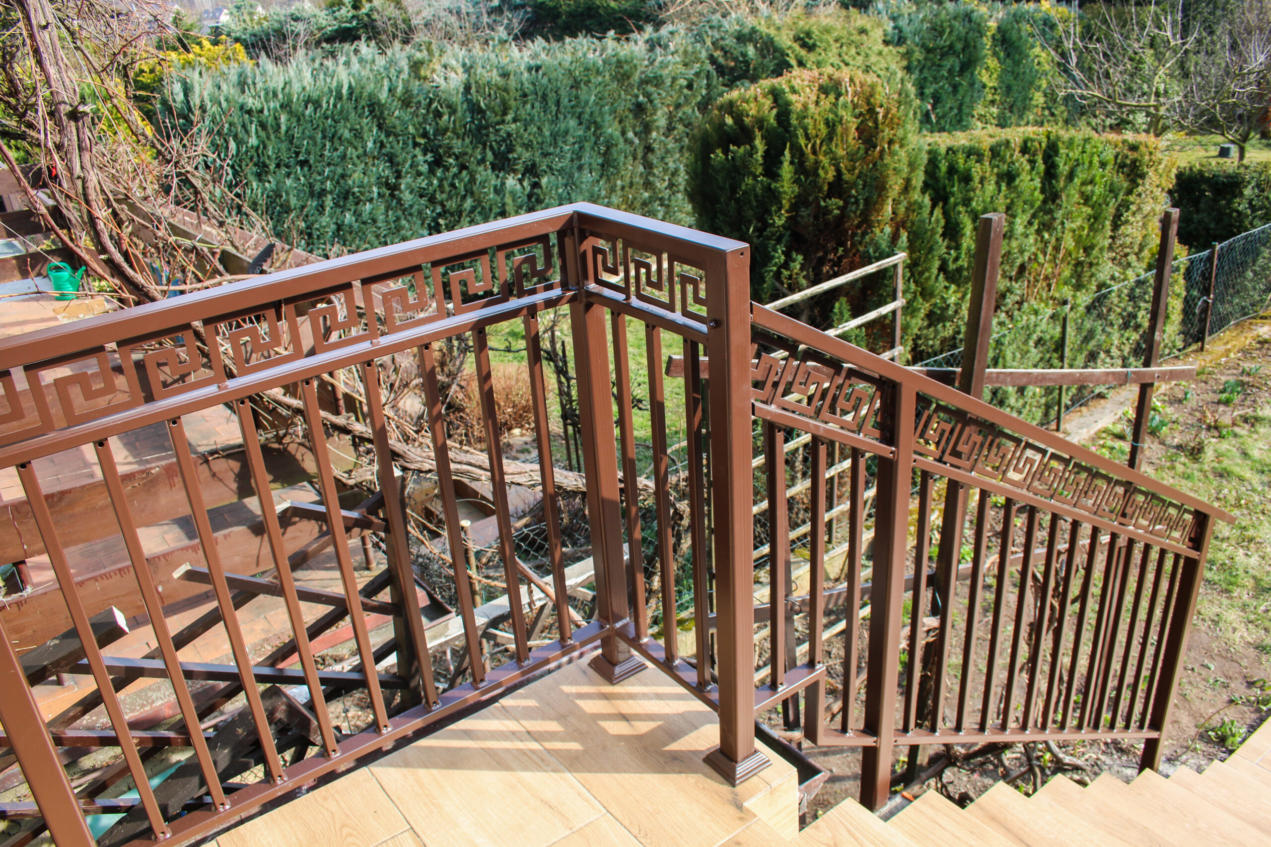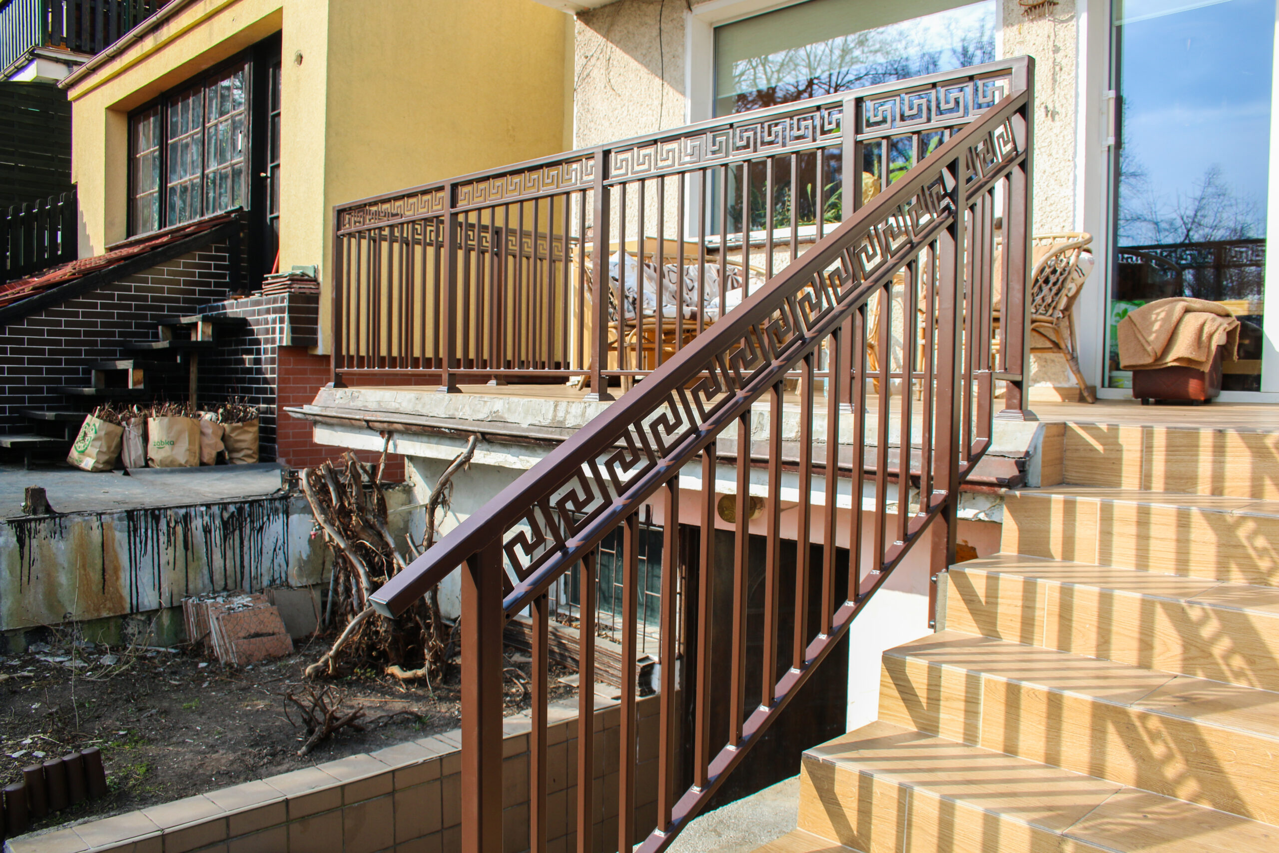 Stalowa balustrada schodowa zewnętrzna, z malowaniem proszkowym na brązowo. Cała produkcja i spawanie w naszym warsztacie, montaż na gotowej klatce schodowej bezpośrednio u klienta.